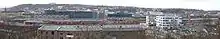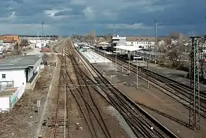 The regional freight traffic along the line declined after the Second World War. Already in the 1980s, Übergabegüterzug ("goods exchange train") traffic dominated the operations.[99] Until the early 1990s, the stations between Ludwigshafen and Neustadt, as well as between Landstuhl and Bruchmühlbach-Miesau, were of great importance for the transport of turnips. In 1990, the decline in freight traffic led to the dismantling of the Einsiedlerhof marshalling yard. Other marshalling yards, which were the starting point for Nahgüterzug ("local goods train") traffic, were located in Saarbrücken, Homburg, Neustadt and Ludwigshafen. There are large freight yards in Neustadt an der Weinstrasse, Kaiserslautern (mainly for the Opel plant), Homburg (Saar) and at the terminus in Saarbrücken. In the meantime, all freight sheds have been closed. Along the Ludwigshafen–Schifferstadt section, additional freight trains run from BASF to Speyer or Germersheim.[97] Between Weidenthal and Neidenfels, there is a siding called Glatz II, which supplies the Neidenfels paper factory of the same name.[100] To the east of Neidenfels, there used to be another siding called Glatz I.[21] The Homburg–Saarbrücken section has little freight traffic. Goods exchange trains run to St. Ingbert, which has freight facilities.[97] Isolated freight traffic also run over the line to the Kaiserslautern Military Community.[101]
