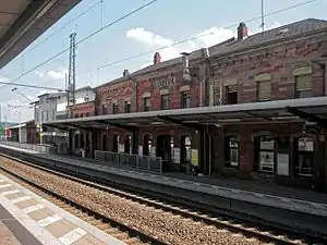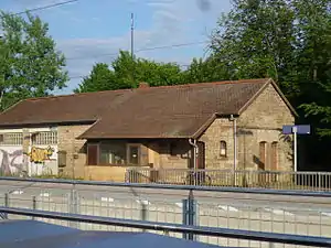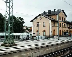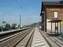 After the outbreak of World War II on 1 September 1939, the line was again used by numerous military transports; as early as 1938 deportations to Dachau had taken place in Kaiserslautern and Ludwigshafen.[37] From 1943 onwards the line was regularly exposed to bombardment, initially the railway lines in Saarbrücken and Ludwigshafen were affected. This was followed by the bombing of Kaiserslautern and Homburg in 1944 and St. Ingbert towards the end of the year. As a result, railway installations were considerably affected. The entrance building of Kaiserslautern Hauptbahnhof was, for example, almost completely destroyed on 28 September and 18 December. The same was true for Hauptbahnhof Homburg. Lambrecht (Pfalz) station was destroyed by fire in March 1945 during combat operations.[40][41]