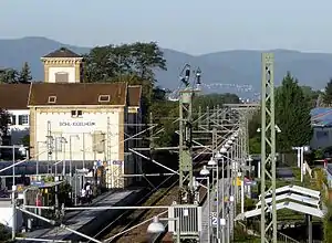 Because of its great importance for long-distance traffic, the electrification of the line began in 1960. Corresponding plans already existed immediately after the war on the French side for the Saarland section, in order to link it more closely to France. Electric locomotives could operate over the Saarbrücken–Homburg section from 8 March 1960 and on the Homburg–Kaiserslautern section from 18 May 1961. The electrification of the remaining section had been delayed mainly because of the numerous tunnels between Kaiserslautern and Neustadt that had to be enlarged. For this reason, this section was temporary only accessible on a single-track basis; the trains were allowed to run at 40 kilometres per hour at most. Due to the restricted capacity, several freight trains ran over the Landau–Rohrbach and Langmeil–Monsheim railways towards Worms from 20 March 1960.[51] The line could be operated electrically along its whole length from 12 March 1964. The flying junction that had existed since 1907 north of Schifferstadt was demolished with the electrification.[26] The tracks between Limburgerhof and Ludwigshafen that had been used exclusively for through freight traffic since 1899 had already been abandoned and were used for the storage of freight wagons.[52]