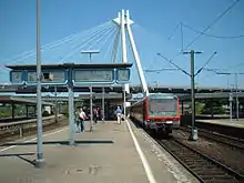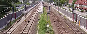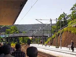 During the German rail reform, the line became the property of Deutsche Bahn on 1 January 1994. From 1995 onwards, Neustadt (Weinstr) Böbig halt, which is located in the eastern area of Neustadt Hauptbahnhof, could be served by trains on the Ludwigshafen–Neustadt line, although previously it had only been served by trains on the Palatine Northern Railway.[64] In 1996, VRN tickets could be used as far as Kaiserslautern.[60] From 1993 to 1999, the number of passengers on the Weidenthal–Neustadt section rose from 1500 to 3270 per day.[65] Neidenfels station went into operation between Lambrecht and Weidenthal in 1998. In May of the same year, the Federal Government and Deutsche Bahn signed a financing agreement worth 351.4 million DM to upgrade the line between Mannheim and Saarbrücken. This work was expected to be completed by 2004.[66] The first stage saw an upgrade for tilting trains with a top speed of 160 km/h. The tracks on the St. Ingbert–Kirkel and Neustadt an der Weinstraße–Ludwigshafen sections are now ready for a line speed of 200 kilometres per hour.[67] A bypass was built, which has allowed long-distance passenger and freight trains to bypass Schifferstadt since 2003.