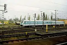 At first, there was still no regular interval timetable.[95] The line between Mannheim and Kaiserslautern was used by an express service on the Würzburg–Pirmasens route.[96] Between 1970 and 1975, the line was used by the TEE 50/51 service (Goethe). There was a clear improvement in long-distance services from May 1985 onwards. With the introduction of the Saar-Palatinate regular interval timetable (Saar-Pfalz-Takt) there were hourly operations between Mannheim and Saarbrücken with Intercity (IC), D-Züg and Eilzug services. In 1989, a framework agreement was signed between the Saarland and DB for new local services, including a CityBahn service on the Saarbrücken–Kaiserslautern route with reduced stops and a Citybahn service on the Saarbrücken–Homburg route with stops at all stations.[86] From 1991 onwards the IR 27 InterRegio service ran on the Saarbrücken–Stuttgart route, continuing to Lindau and Bregenz at two-hour intervals. At the same time, there were the first IC services on the Saarbrücken–Dresden route and EuroCity services between Paris and Frankfurt. Both long-haul routes also operated at two-hour intervals. One year later, IC trains replaced all D-Züg services.