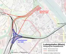 Ludwigshafener Hauptbahnhof was an operational obstacle because of its construction as a terminus. In the early 1960s, construction work for a through station started at a new location. DB took it into operation in May 1969 and it was officially opened on 1 June. Its predecessor was then demolished along with the associated railway tracks.[53] With the dissolution of the railway division of Mainz on 1 June 1971, the Ludwigshafen–Frankenstein section was transferred to the responsibility of the railway division of Karlsruhe.[39] From 1 August of that year, the railway division of Saarbrücken was responsible for the entire section of the line from immediately west of Frankenstein.[54]