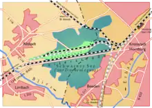 The initial planning of a railway line in the north-south direction within the Palatinate, which had belonged to Bavaria since 1816, was set aside for an east-west line, which was mainly promoted by Palatine entrepreneurs as facilitating the transport of Saar coal to the Rhine.[7] The planners revised their initial considerations of St. Ingbert as the western terminus, under pressure from Prussia, which wanted to have the long-term connection to Saarbrücken passing as far as possible over its own territory. That is why the planners considered Bexbach, with an extension via Neunkirchen and the Sulzbach valley.[8] A suggestion that the railway line run via Zweibrücken and from there along the Schwarzbach via Rodalben, Annweiler and Langenkandel on the Rhine, did not proceed.[9] The eastern terminus was disputed between Speyer, the capital of the Palatinate and the emerging port and trading centre of Rheinschanze. A memorandum supporting the interests of Speyer argued that it was an old trading town, whereas Rheinschanze was just a military base that would merely serve the transfer of goods. These endeavours were unsuccessful, as the part of the up-and-coming Rhine-Neckar Region to the east of the Rhine, especially Mannheim, was the focus of attention and the export of coal to the area beyond the Rhine was considered more important.[10] Proposals for a line along the Dürkheim Valley also failed, since its side valleys were too low and, above all, the Frankensteiner Steige (Frankenstein climb) would have had too steep. This route would have required stationary steam engines and rope haulage to overcome the differences in altitude. For this reason it was decided to proceed with a route along the valley through Neustadt.[11]