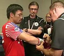 After Thurman's fight with Josesito López, he publicly said he wanted to fight Pacquiao next.[5] It was initially thought that Errol Spence Jr. would be next on Pacquiao's list when he came up the ring after Spence easily disposed of Mikey Garcia. It had also been rumored that Pacquiao would be facing Thurman next and Spence would instead have a unification bout with Shawn Porter.[6] On May 11, 2019 it was announced that Pacquiao–Thurman would happen on July 20, 2019 and a few days after, MGM Grand Garden Arena announced that they would be hosting the fight.[7] Betting odds started in favor of Thurman but slowly went Pacquiao's way as the fight drew closer.[8] Throughout the promotion, Thurman had nice things to say about Pacquiao being a legend as a sign of respect and would follow it up with how he planned on finishing Pacquiao's career.[9]