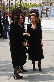 A mantilla is a traditional Spanish lace or silk veil or shawl worn over the head and shoulders, often over a high comb called a peineta, popular with women in Spain.[1] It is also worn, without the peineta, by Eastern Orthodox women in Russia, often white, with the ends crossed over neck and draped over the opposite shoulder. The shape, design and use are different from an ordinary veil.