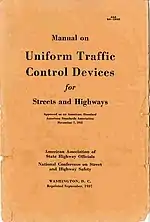 In January 1927, the American Association of State Highway Officials (AASHO) published the Manual and Specifications for the Manufacture, Display, and Erection of U.S. Standard Road Markers and Signs to set standards for traffic control devices used on rural roads.[2] Despite the title, this manual did not have any guidance on pavement markings.[2] In the archaic American English of the 1920s, the term "road marker" was sometimes used to describe traffic control devices which modern speakers would now call "signs."[2] In 1930, the National Conference on Street and Highway Safety (NCSHS) published the Manual on Street Traffic Signs, Signals, and Markings, which set similar standards for urban settings, but also added specific guidance on traffic signals, pavement markings, and safety zones.[2] Although the two manuals were quite similar, both organizations immediately recognized that the existence of two slightly different manuals was unnecessarily awkward, and in 1931 AASHO and NCSHS formed a Joint Committee to develop a uniform standard for both urban streets and rural roads. This standard was the MUTCD.[1]