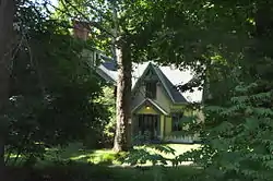 Maplewood Farm consists of several parcels of land, organized in a long strip that is roughly bisected by River Road, and whose western edge is the Presumpscot River. Most of this land is now wooded, the principal exception being a large clearing in which the farm's buildings are located, set at a remove from the southwest side of River Road. The main house is a c. 1770 two story wood frame structure, which underwent significant alterations in about 1850 to give it its present Gothic Revival appearance, with steeply pitched gables, bargeboard decoration, and lancet-arched windows. Also surviving from the mid-19th century are two barns and a small cottage. The small Anderson family cemetery is set near the road, southeast of the building complex.[2]
