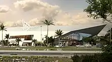 The Olympic Sports Initiation Center[6] (designed in 2015) is a low rise development located inside a bigger master plan at the called Cidade Esportiva da Baixada Fluminense in Rio de Janeiro, Brazil. This 30-hectare master plan, also designed by Rodriguez Pons & Partners, includes, a sports center, residential units, school, retail, native forests, lagoons and the Brazilian Volunteer Firefighters Brigade. The sports buildings have a clean and tensioned silhouette with which the white horizontal lines of the grades and the curve of the grades-roof contrast with the vertical sun protection wooden blinds of the Indoor Arena, and the Aquatics Stadium. All of it clearly reflects his personal “Wood & White” design style. Between all these buildings, a multipurpose open air plaza joins them with the parking areas and the rest of the sports fields "connected" by large overhangs, canopies, fountains and ramps.
