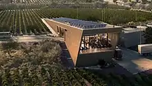 One of his first relevant projects was the Punta Jabali Winery[5] (designed in 2014) which presented the opportunity to look at the winery as a building type, using the topography of the site to aid the winemaking process, and to create the optimum natural working conditions, while reducing the building's energy demands and its impact on the landscape. The Winery is oriented on a north-south axis, using the site inclination to allow grapes to enter the building by gravity. Grape access is a key space in wine making; a covered external space was created in order for the grapes to be selected manually. The building's levels expresses the main stages of production: fermentation in steel vats; ageing in oak barrels; and maturation in bottles; at the highest level we designed an operations hub, from which all stages of the production process can be controlled. The upper volume of the building emerges from the land, wanting to be the business card of the winery. It is clearly expressing the values that prevail in the project. The building enjoys natural light through an oversized fully openable window, views into the vineyard and a direct connection to the Barrel Hall and Cellar underground. Lined with slats from recycled wine barrels, the public areas evoke the rich tradition of winemaking in the region.