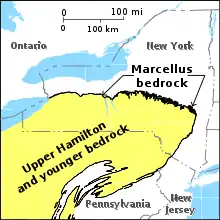 The Marcellus is found throughout the Allegheny Plateau region of the northern Appalachian Basin of North America. In the United States, the Marcellus Shale runs across the Southern Tier and Finger Lakes regions of New York, in northern and western Pennsylvania, eastern Ohio, through western Maryland, and throughout most of West Virginia extending across the state line into extreme western Virginia.[24] The Marcellus bedrock in eastern Pennsylvania[25] extends across the Delaware River into extreme western New Jersey.[1] It also exists in the subsurface of a small portion of Kentucky and Tennessee.[26] Below Lake Erie, it can be found crossing the border into Canada, where it stretches between Port Stanley and Long Point to St. Thomas in southern Ontario. [27][28]