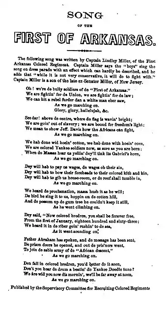The "Marching Song of the First Arkansas Colored Regiment" is known today through the song sheet issued by the Supervisory Committee for Recruiting Colored Regiments in Philadelphia. The "Song of the First of Arkansas," written in dialect, was one of several broadsides issued by the Committee for recruitment purposes. The broadside had this brief introduction: "The following song was written by Captain Lindley Miller, of the First Arkansas Colored Regiment. Captain Miller says the 'boys' sing the song on dress parade with an effect which can hardly be described, and he adds that 'while it is not very conservative, it will do to fight with.' Captain Miller is a son of the late ex-Senator Miller, of New Jersey."[10] The song was also included in a collection of Union Army songs published in New York in 1864.[11]
