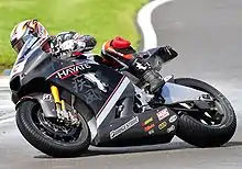 On 2 October 2011, Melandri signed a contract to ride with the BMW World Superbike team for the 2012 season,[16] after Yamaha elected not to continue with a factory team after the 2011 season. Melandri achieved BMW's best result, at the time, in the Superbike World Championship, with a second place in the season-opening race at Phillip Island, having started 13th on the grid.[17] Mixed results followed at Imola, Assen and Monza, but Melandri achieved BMW's first Superbike World Championship victory at the European round at Donington Park,[18] leading home teammate Leon Haslam in a 1–2 finish. Melandri and Haslam collided in the meeting's second race, denying a weekend sweep for BMW. From that point, Melandri won races at Miller Motorsports Park, Motorland Aragón and a double at Brno, to move within 21 points of the championship lead held by Max Biaggi.[19]