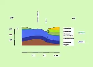 The strata below the 120 m thick Kimmeridgian do not outcrop, but the presence of 210 m of underlying Oxfordian, Bajocian and Bathonian strata is known from drilling results in the vicinity. Whether thin Lias underlies the Dogger cannot be ascertained.