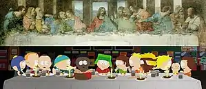 The episode's title comes from the Jimmy Buffett's Margaritaville blender featured in the episode, which serves as a metaphor for the housing bubble.[7] "Margaritaville" is also the name of a popular 1977 song by Jimmy Buffett, who has been the butt of South Park humor in the past.[8] In "Margaritaville", Kyle is portrayed as a Jesus-like savior who makes a tremendous sacrifice to save the economy.[8] A dinner he has with his friends is portrayed as the Last Supper, the final meal Jesus had with his Twelve Apostles before his death.[9] Almost inevitably Cartman takes on the role of Judas Iscariot, the disciple who betrayed Jesus (in the Last Supper scene he even sits in the same position as Judas in da Vinci's painting), while some of the South Park residents form a council.[8] Kyle uses a platinum American Express card to pay off the debts of all South Park residents.[6]