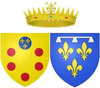 In an effort to restore domestic harmony, Cosimo III sent for Madame du Deffand, Marguerite Louise's childhood governess who had sided with the Grand Duke before.[23] However, because of a string of deaths in the Orléans family, the governess arrived with some delay, in December 1672.[28] By then, Marguerite Louise was in the depths of despair, and asked to be allowed visit Villa Poggio a Caiano, a Medici villa, ostensibly for worship at a nearby shrine.[29] Once there, she refused to return, which resulted in a two-year standoff between herself and the Grand Duke, for he would not consent to her return to France, though she begged for this in her parting letter to him.[30] Madame du Deffand's mission having failed, Louis XIV made one final attempt to reconcile the Grand Ducal couple, to no avail.[31] Therefore, all attempts at conciliation having failed, Cosimo capitulated to Marguerite Louise, in a contract signed on 26 December 1674: Marguerite Louise, provided for with a pension of 80,000 livres, was allowed to leave for France, but she had to confine herself to the Abbey of Saint Peter at Montmartre and surrender her rights as a Royal Princess of France.[32] Overjoyed, the Grand Duchess departed for France laden down with the fixtures and furniture of Villa Poggio a Caiano, for, in her own words, she had no intention "of setting forth without her proper wages".[33]