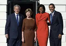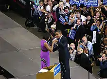 One of her clients is former First Lady Michelle Obama. A client of Pinto's referred Obama to her in 2004.[46] Obama wore a white gown designed by Maria Pinto to Oprah Winfrey's Legends Ball in May 2005.[26] When Ebony magazine photographed the Obamas, calling them "the Hottest Couple in America," Michelle was wearing pants made by Pinto.[47][48] On June 3, 2008, Obama wore a Pinto dress to a campaign speech in St. Paul, Minnesota, where she and her husband exchanged a fist bump that became known as "the fist bump heard 'round the world."[5][20][49] On August 25 of that year, Michelle Obama wore a teal dress from Pinto to the 2008 Democratic National Convention.[20] Obama wore an orange sheath designed by Pinto for a visit to the White House with George and Laura Bush shortly after the election.[20][50] Michelle Obama was on the cover of Parade magazine in June 2014 wearing a dress from the M2057 collection.[51] On October 8, 2014, she invited Pinto to attend her Celebration of Design event at the White House.[52]