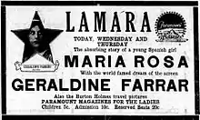 Maria Rosa is a surviving 1916 American silent drama film directed by Cecil B. DeMille. It was based on a 1914 Broadway stage play Maria Rosa by Àngel Guimerà. On the stage the principal parts were played by Dorothy Donnelly and Lou Tellegen, future husband of this film's star Geraldine Farrar.[1][2]