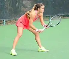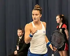 In 2019, her first big significant result came at the Charleston Open, where she reached quarterfinal and recorded another top 10 win, defeating world No. 6 Kiki Bertens, before she lost to Caroline Wozniacki.[4] In early May, she won her first WTA singles title at the Morocco Open in Rabat, defeating Johanna Konta in the final.[5] At the Italian Open, she reached her second-career Premier 5 semifinal,[6] where she also defeating world No. 5 Petra Kvitová after the retirement in the third set,[7] but later lost to world No. 7 Karolína Plíšková. For the second year in a row, she reached semifinal at the Silicon Valley Classic where she also made another top 10 win over world No. 7 Elina Svitolina.[8] She then continued with improvements, reaching quarterfinal at the Cincinnati Open including two top 10 wins over Kvitová and Aryna Sabalenka, before she lost to world No. 2 Barty.[9] For the first time, she qualified for the year end championship WTA Elite Trophy, where she finished participation in a round-robin group, after she lost to Sabalenka and Elise Mertens.[10]