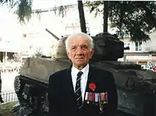In 1941 Tomaszewski was assigned to the 6th Armoured Regiment "Children of Lwów"[1] and took part in the Siege of Tobruk. In 1944 he was engaged in the bloody Battle of Monte Cassino.[2] Following the fall of the monastery on 18 May, Polish forces faced the Hitler Line which blocked the road to Rome. Tomaszewski, posted to the regimental command HQ, directed an armoured assault by Sherman tanks on the strongpoint of Piedimonte San Germano, then held by detachments of crack German paratroopers equipped with anti-tank emplacements. Although faced with difficult terrain, the lack of expected Indian infantry support and dogged German resistance they succeeded in taking the town. The anniversary of the town's liberation is still celebrated by its inhabitants. Tomaszewski continued to serve in the 2nd Polish Corps until the end of the Italian Campaign in 1945.