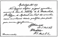 Beginning January 17, 1848, the eight founders of the Misericorde Sisters, including Cadron-Jetté, commenced practical training in midwifery under Dr Eugène-Hercule Trudele, a young obstetrician.[41] The objective of the training was to better prepare the sisters to meet the obligations of their fourth vow. The training lasted for 18 months and concluded with an examination before two members of the College of Physicians and Surgeons of Lower Canada, with the result that on July 12, 1849, the women received formal certificates of midwifery.[42] It is most likely during this period or the years immediately following that Cadron-Jetté learned to read and write.[43]