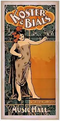 Lloyd made her American stage début in 1893, appearing at Koster and Bial's Music Hall in New York. She sang "Oh You Wink the Other Eye", much to the delight of her American audiences. Other numbers were "After the Pantomime" and "You Should Go to France and See the Ladies Dance", which both required her to wear provocative costumes.[72] Her performances pleased the theatre proprietors, who presented her with an antique tea and coffee service.[27][n 14] News of her success reached home, and the London Entr'acte reported that "Miss Marie Lloyd made the biggest hit ever known at Koster and Bial's variety hall, New York."[74]