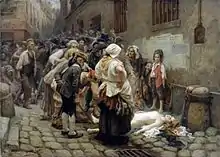 The agents of her father-in-law, who had been tasked with acquiring her remains and having them temporarily buried until they could be interred in Dreux, reportedly mixed in with the crowd in order to be able to gain possession of it.[2] They averted the intentions of the crowd to display the remains before the home of de Lamballe and her father-in-law at the Hôtel de Toulouse by saying that she had never lived there, but at the Tuileries or the Hôtel Louvois.[2] When the carrier of the head, Charlat, entered an alehouse, leaving the head outside, one agent, Pointel, took the head and had it interred at the cemetery near the Hospital of the Quinze Vingts.[2]
