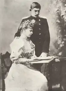 Around this time, King Carol I of Romania was looking for a suitable bride for Crown Prince Ferdinand, in order to secure the succession and assure the continuation of the House of Hohenzollern-Sigmaringen. Possibly motivated by the prospect of removing tensions between Russia and Romania on the subject of control over Bessarabia, the Duchess of Edinburgh suggested that Marie meet Ferdinand.[38] Marie and Ferdinand first became acquainted during a gala dinner and the pair conversed in German. She found him shy but amiable, and their second meeting went just as well.[40] Once the pair were formally engaged, Queen Victoria wrote to another granddaughter, Princess Victoria of Hesse and by Rhine, that "[Ferdinand] is nice & the Parents are charming–but the country is very insecure & the immorality of the Society at Bucharest quite awful. Of course the marriage will be delayed some time as Missy won't be 17 till the end of October!"[41] German Empress Victoria, Marie's aunt, wrote to her daughter, Crown Princess Sophia of Greece, that "Missy is till now quite delighted, but the poor child is so young, how can she guess what is before her?"[42] In late 1892, King Carol visited London in order to meet the Duke of Edinburgh and Queen Victoria, who eventually agreed to the marriage and appointed him a Knight of the Garter.[43]