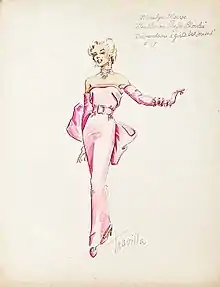 When the costume designer William Travilla, known simply as Travilla, began working with Marilyn Monroe, he had already won an Oscar for his work in Adventures of Don Juan in 1948. Travilla designed the clothes of the actress in eight films, and later claimed to have had a brief affair with Monroe.[3] In 1953 Travilla designed the costumes for Gentlemen Prefer Blondes.