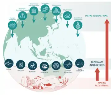 Marine ecosystems are important sources of ecosystem services and food and jobs for significant portions of the global population. Human uses of marine ecosystems and pollution in marine ecosystems are significantly threats to the stability of these ecosystems. Moreover, much of the carbon dioxide causing global warming and heat captured by global warming are absorbed by the ocean, ocean chemistry is changing through processes like ocean acidification which in turn threatens marine ecosystems. Because of these opportunities in marine ecosystems for humans and the threats created by humans, the international community has prioritized "Life below water" as Sustainable Development Goal 14 to "Conserve and sustainably use the oceans, seas and marine resources for sustainable development".[4]