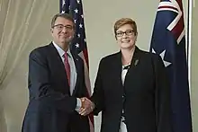 Payne oversaw the final months of the long-anticipated 2016 Defence White Paper, which she launched in February 2016 with Turnbull and Chief of the Defence Force Mark Binskin. She also launched the government's Integrated Investment Program and the Defence Industry Policy Statement.[15] A spokeswoman for the Chinese Foreign Ministry criticised the white paper for its "negative" remarks about the South China Sea. Payne responded that "we have a strong defence relationship [with China] but we do have a point of difference in this regard and we are certainly not going to take a backward step in articulating our position".[16] In April 2016, she and Turnbull announced that French firm DCNS, now called Naval Group, had been awarded a $50 billion contract to build a new fleet of submarines for the Royal Australian Navy. The submarine project will be undertaken in Adelaide rather than in France, generating 2,800 jobs.[17] Payne had abdominal surgery in late 2016, which resulted in the deferral of the "two-plus-two" meeting between the foreign and defence ministers of Australia and Japan.[18]