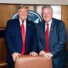 Mark Randall Meadows (born July 28, 1959) is an American politician who served as the 29th White House chief of staff from 2020 to 2021. He served as the U.S. representative for North Carolina's 11th congressional district from 2013 to 2020. A member of the Republican Party, Meadows chaired the House Freedom Caucus from 2017 to 2019. He was considered one of President Donald Trump's closest allies in Congress before his appointment as chief of staff.[1]