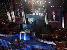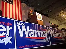 Warner immediately gained the endorsement of most national Democrats. He held a wide lead over his Republican opponent, fellow former Virginia governor Jim Gilmore (and Warner's predecessor), for virtually the entire campaign.[24] Warner delivered the keynote address at the 2008 Democratic National Convention.[25]