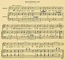 For years it was only known traditionally, and does not appear among the many anecdotic songs printed in France during the middle of the 18th century. Beaumarchais used the tune in his 1778 play The Marriage of Figaro for a despairing love song for Cherubino.[1][2] In 1780 it became very popular. For instance, the tune concludes a sonata (in D-major) for viola d'amore and viola composed by Carl Stamitz in 1780 while in Paris. And it happened that when Louis XVII of France was born in 1785 (son of Louis XVI and Marie Antoinette and heir to the French throne) he was wet-nursed by a peasant named Geneviève Poitrine. The nurse, whilst rocking the royal cradle, sang "Marlborough s'en va-t-en guerre" and the dauphin, it is said, opened his eyes at the name of the great general. The name, the simplicity of the words, and the melodiousness of the tune, interested the queen, and she frequently sang it. Everybody repeated it after her, including the king. The song was sung in the state apartments of Versailles, in the kitchens and in the stables – it became immensely popular.[3][4]