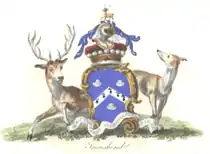 ![]() ![]() Arms: Azure, a chevron ermine between three escallops argent. Crest: A Stag statant proper, attired and unguled Or. Supporters: Dexter: a Stag statant proper attired and unguled Or; Sinister: A greyhound Argent. | |