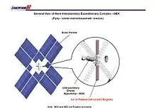 The idea of Marpost was then picked up by Leonid Gorshkov, one of the main designers of the RKK Energia (Raketno-Kosmicheskaya Korporatsiya – Rocket-Space Corporation) company, the leading Russian space developer and builder of human spaceflight hardware.[3] Gorshkov proposed to use the space complex called MEK (Mezhplanetniy Ekspeditsioniy Komplex, or Interplanetary Expeditionary Complex), that was already developed and designed by RKK Energia. The projected cost would be $14–16 billion and the period of realization would be 12–14 years. The elements of MEK were initially proposed to be launched by the Energia heavy booster. Later however, in order to lower the cost of the mission, the elements of MEK were proposed to be launched by a Proton or Angara rocket. The overall mass of MEK is estimated at 400 tons. The flight from Earth orbit to Mars would be powered by ion thruster engines.[4]