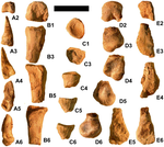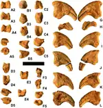| Vertebrae (A-G), possible forelimb bones (H-I), a scapula (J-K), and pelvic bones (L-M) | |