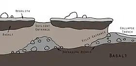 There has been increased interest in the identification and investigation of lava tubes because they could present scientists with information regarding the geological, paleohydrological, and supposed biological histories of the planet.[5] When speaking about lunar lava tubes, Dr. William "Red" Whittaker, CEO of Astrobotic Technology, states that "something so unique about the lava tubes is that they are the one destination that combines the trifecta of science, exploration, and resources."[6] Access to uncollapsed sections of lava tubes can be done by entering at the end of rille, through skylights, or by drilling or blasting through the roof of a lava tube.[3] Initial exploration of lava tubes may involve rovers, but with difficult challenges. Traditional skylights have large rubble piles directly below them (as seen in the first figure) which would be an obstacle for the rover. The vertical drop that the rover would have to perform would also have to be taken into consideration, as well as the ability of the rover to remain in communication with assets at the surface or in orbit.[7]