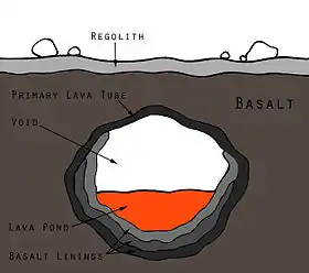 Martian lava tubes are volcanic caverns on Mars that are believed to form as a result of fast-moving, basaltic lava flows associated with shield volcanism.[1] Lava tubes usually form when the external surface of the lava channels cools more quickly and forms a hardened crust over subsurface lava flows.[2] The flow eventually ceases and drains out of the tube, leaving a conduit-shaped void space which is usually several meters below the surface. Lava tubes are typically associated with extremely fluid pahoehoe lava.[3] Gravity on mars is about 38% that of Earth's, allowing Martian lava tubes to be much larger in comparison.