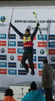 Ahead of the 2014 Winter Olympics in Sochi Fourcade admitted that he will be under pressure, but that he will be able to handle it.[62] He also said that he is capable of winning every race he enters but that there will be others, mainly Emil Hegle Svendsen, with a great level of self-confidence.[63] The first non-team race, the sprint, ended in disappointing sixth place for Fourcade.[64][65] However, he was able to turn the tables in the following pursuit, climbing from sixth to first, winning his first olympic gold medal.[66] After the last shot at the last standing shooting Fourcade famously stretched his arm in the air and pumped his fist, explaining that it was all happiness, knowing the weight of that shooting.[67] In the individual, Fourcade carried on his good form, hitting 19 out of 20 targets in winning his second olympic gold medal.[68] The mass-start ended in a slight disappointment for Fourcade, for even though claiming his third medal of the games, a silver, he lost the gold by some centimeters, Svendsen claiming the victory in photo-finish.[69] Regardless of that, Fourcade was by far the most successful male biathlete of the 2014 Winter Olympics.[70] In addition, he became only the second male biathlete after Ole Einar Bjørndalen to have won a non-team Olympic gold medal, a non-team World Championships gold medal, the Overall World Cup title and all of the discipline World Cup titles in his career.[38][71]
