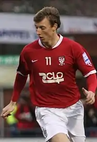 He had a trial with Stockport County of League Two during their pre-season trip to Ibiza in August 2006, but was not offered a contract.[17] He was being tracked by Hartlepool United and York City,[17] and also attracted interest from Guiseley.[19] He eventually signed for Conference National club York on 31 August for an undisclosed five-figure fee after having made four appearances and scored one goal for Frickley at that point in 2006–07.[20][21] He made his debut a day later in a 0–0 draw with Stafford Rangers after coming on as a 57th minute substitute.[22] During his first start for the team, he was substituted for goalkeeper Arran Reid in the 17th minute after Tom Evans was sent off.[23][24] He scored his first goal for York in the team's 3–2 home loss to Morecambe on 12 September.[25] A week later, he scored both York's goals in a 2–1 away victory over Woking.[26] He featured in both legs of York's play-off semi-final defeat by Morecambe 2–1 on aggregate and finished 2006–07 with 45 appearances and eight goals,[27] after which the club exercised their option to extend his contract for another season.[28]