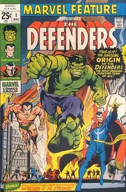 The first series was published for twelve issues from December 1971 until November 1973.[2] The lead story in Marvel Feature #1, by writer Roy Thomas and artist Ross Andru, featured the first team-up of the Hulk, Doctor Strange, and the Sub-Mariner as the Defenders.[3] The first two issues of Marvel Feature were in the 52-page format, with the remaining pages filled out by a new Doctor Strange solo tale and a Sub-Mariner reprint.[1] The Defenders continued as the stars of Marvel Feature for two more issues and then received their own self-titled series in August 1972.