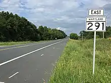 Maryland Route 291 (MD 291) is a state highway in the U.S. state of Maryland. The highway runs 18.34 miles (29.52 km) from MD 20 in Chestertown east to the Delaware state line east of Millington, where the highway continues east as Delaware Route 6 (DE 6). MD 291 parallels the Chester River along the southern edge of Kent County and connects Chestertown with U.S. Route 301 (US 301). The highway follows much of what was originally MD 447, which was constructed between US 213 in Chestertown and MD 290 at Chesterville around 1930. MD 291 itself was built east of Millington around 1930. The highway was extended west toward Chesterville in the early 1930s, but it was not complete to MD 290 until the late 1940s. MD 291 was extended west to US 213 along a partially new alignment in the early 1960s, superseding MD 447. MD 291 was reconstructed along its entire length between the mid-1960s and mid-1970s, and it reached its present western terminus at MD 20 in 1969.