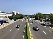 MD 410 then branches into its own road again, where it becomes a four lane divided highway. It crosses the Northwest Branch Anacostia River and enters Hyattsville. The highway expands to six lanes as it passes between The Mall at Prince George's and Metro's Prince George's Plaza station. Beyond University Town Center and the headquarters of the National Center for Health Statistics, MD 410 approaches a four-way intersection with the northern end of MD 500 (Queens Chapel Road) and the southern end of Adelphi Road.[1][3]