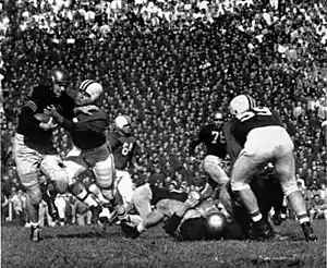 In a surprising choice, former Maryland assistant coach and Citadel head coach Bobby Ross, who was not a big-name at the time, was selected as head coach in 1982. In contrast to Claiborne's style, Ross implemented a high-powered offense. He replaced the I-veer triple option with an NFL-style offense that emphasized dropback passes, bootlegs, and play action passes.[26] This change in tactics and strategy enabled starting quarterback Boomer Esiason the opportunity to excel to a degree not seen under Claiborne the season prior. Esiason said, "Ross has an uncanny knack of putting players in a position to not only succeed, but to overachieve . . . If he didn't show up at Maryland, I don't know what would have happened to me. I don't know if I would have turned into the player I was and played in the NFL."[26] During this time, several Maryland quarterbacks went on to careers in the National Football League (NFL), and the school was nicknamed "Quarterback U" as a result.[27][28]