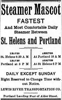In May 1895, the Lewis River Transportation Company advertised Mascot as the "fastest and most comfortable steamer between St. Helens, Oregon and Portland."[15] Every day except Sunday, Mascot left St. Helens at 6:30 a.m. and arrived at Portland at 10:00 a.m.[15] Returning, Mascot left Portland at 3:00 p.m. and arrived at St. Helens at 6:00 p.m.[15] Fare was 25 cents.[16]
