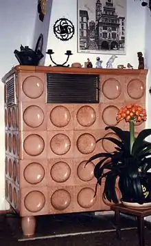 The tilestove (German: Kachelofen, "tile stove") design, a relatively large home heater surrounded with ceramic tile, has existed for at least five centuries. During the Renaissance period, the builders of cocklestoves were part of a distinct trade and were called hafnermeister. A cocklestove uses a maze-like passage created out of firebrick to release gases and smoke from the wood fire slowly, allowing the firebrick to retain as much heat as possible from the gases and smoke. The ceramic tile surrounding the cocklestove also acts as insulation to retain heat. Cocklestoves were carefully designed so that the minimum amount of heat would escape, only as much as needed to warm the flue to maintain a proper air draught. The firebrick used in cocklestove construction holds 80% more heat than ferrous metals such as cast iron, while its heat conductivity is 1/45 that of iron or steel.[4] A cocklestove is efficient enough to warm a house for up to 6 to 12 hours after the fire has stopped burning.[5]