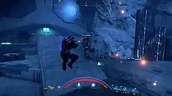 Combat in Mass Effect: Andromeda takes place in real-time, and unlike previous installments in the series, pausing the game to aim or use skills from a menu is no longer a feature.[29] During action sequences, the player has direct control of Ryder from an over-the-shoulder perspective, who can move around the battlefield in a variety of ways, including a side-to-side dash or vertical leap into the air using a jetpack.[11] When the player approaches an object, Ryder will automatically take cover, providing the player with protection in battle.[29] The game encourages players to keep moving during combat with large, open battlefields and enemies that attack from all angles,[11] but also allows for both aggressive and defensive strategies.[28]
