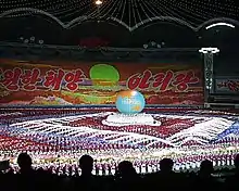 The gymnastics exhibit the North Korean idea of "ilsim-dangyeol" (single-minded unity), as well as nationalism.[2][3]