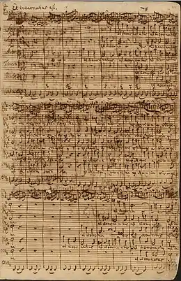 Two autograph sources exist: the parts for the Kyrie and Gloria sections that Bach deposited in Dresden in 1733, and the score of the complete work that Bach compiled in 1748–50, which was inherited by C.P.E. Bach (the autograph has been published in facsimile from the source in the Staatsbibliothek zu Berlin.[48] However, for his 1786 public performance of the Symbolum Nicenum, C.P.E. Bach, as was typical practice in the era, made additions to the autograph score for performance by adding a 28-bar introduction, replacing the now-obsolete oboe d'amore with newer instruments (clarinets, oboes, or violins) and making other changes in instrumentation for his own aesthetic reasons. C.P.E. also wrote in his own solutions to reading some passages made nearly illegible by his father's late-life handwriting problems.[49][50]