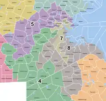 Massachusetts's 5th congressional district is a congressional district in eastern Massachusetts. The district is represented by Katherine Clark. Massachusetts congressional redistricting after the 2010 census has changed the borders of the district starting with the elections of 2012, with the new 3rd district largely taking the place of the old 5th.[3] The 5th district covers many of the communities represented in the old 7th district. As of 2010, the population of the 5th congressional district was 727,515. On July 15, 2013, Ed Markey resigned from the seat to become the junior Senator from Massachusetts. On December 10, 2013, Democrat Katherine Clark won a special election to fill the seat for the remainder of the 113th Congress.[4] She was sworn into office on December 12, 2013.